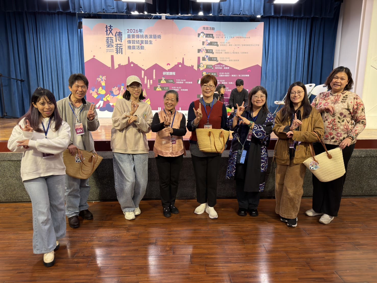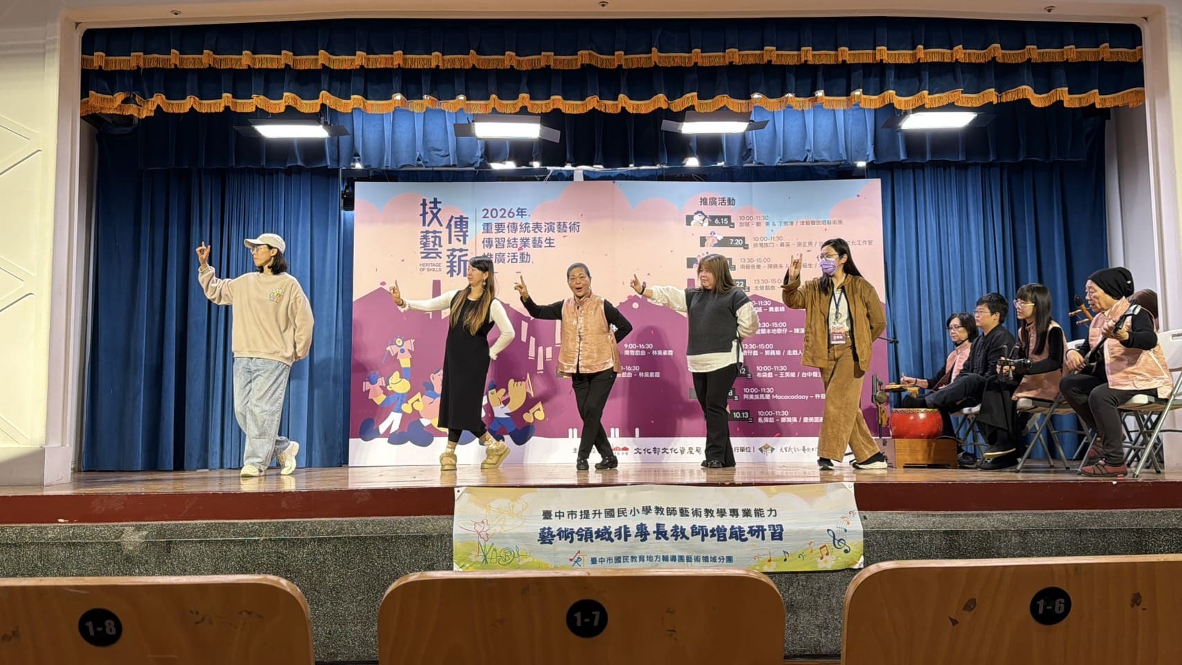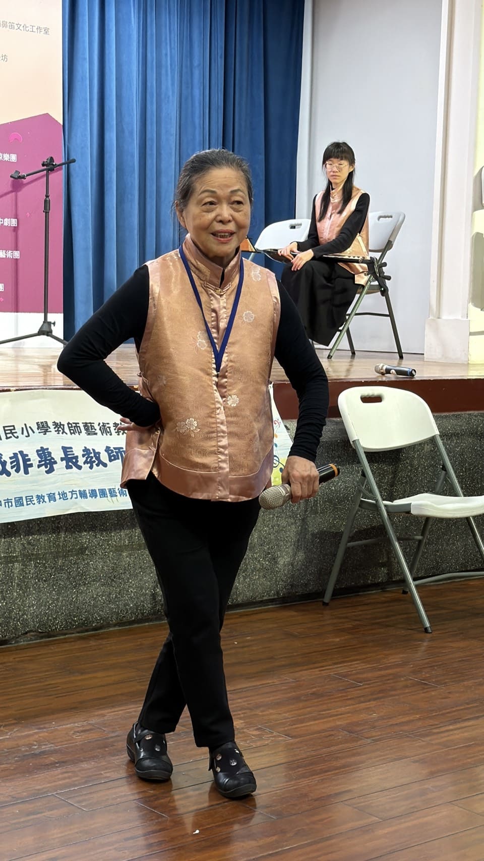 第二天的研習內容,老師帶著大家將「曲」練得更為熟悉,除了一首首的教唱外,搭配著輪唱、齊唱、接唱的形式,讓大家在不知不覺中更為熟悉旋律與歌詞的結合,慢慢的大家更有自信的唱著,慢慢的搭配上「科」部身段的練習,使動作更加熟悉,一次次地站上舞台的排練,使得大家更有自信的展現肢體,更比前天的動作多了些架勢呢!最後曾仰賢教授、文化局副局長及科長更是親臨現場觀賞大家最後的表演,明顯的大家有些緊張,但以兩天的學習來說表現得真是有模有樣呢!
