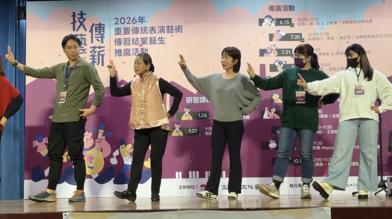 在第一天的研習中,老師更是不藏私地提供了豐富的紙本講義,內容包含了兩套的「譜」,並且一句句耐心的指導著大家唸出帶有泉腔文讀的詞,再一句句加入動聽的旋律,成了韻味十足的「曲」,對於傳統戲曲初階者的大家,更是容易朗朗上口,加上反覆練唱與聆聽,即使下課後旋律依然縈繞腦海中,下午開始了「科」部的身段練習,老師在示範「旦」角中充滿魅力與古典柔情,在「生」角中展現柔中帶剛的英姿,而「丑」的舉手投足間充滿靈動感,十分吸睛,也帶著大家做出兩套科部的身段練習,雖然只是簡單的開始練習,卻也能在動作中感受到「指、腕、臂」間重要的連動性並做到良好的伸展,真的令人十分佩服每一位在台上的戲子們。